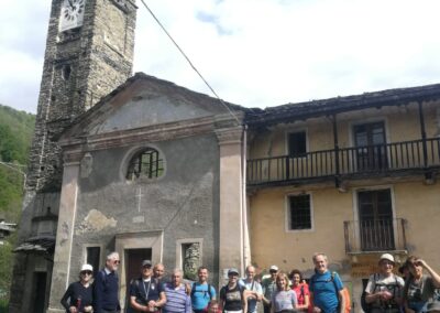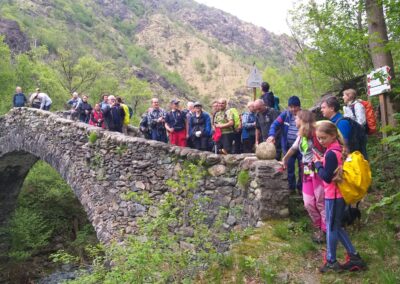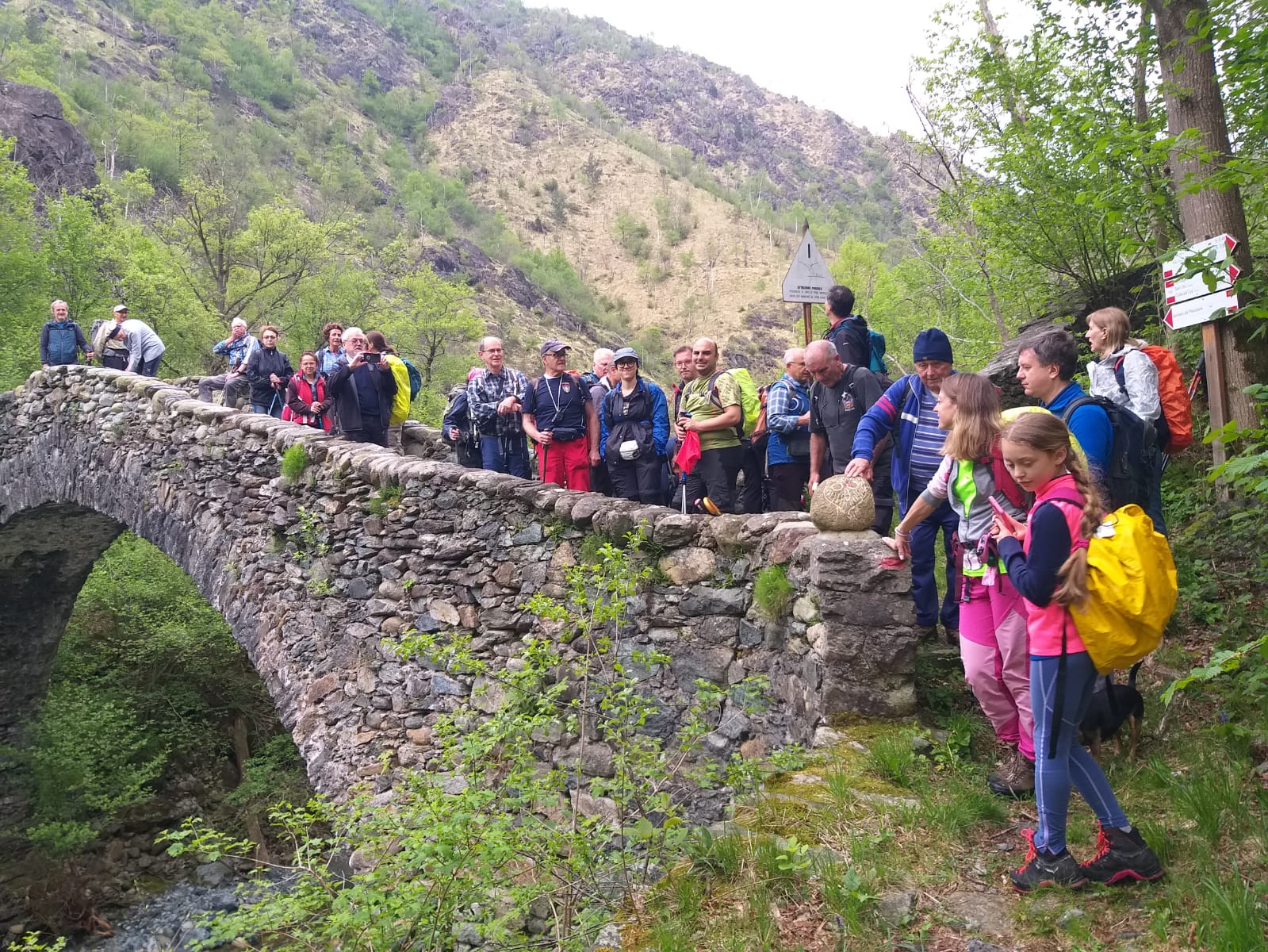Malgrado le brutte previsioni ci siamo trovati alla stazione di Germagnano puntuali in 29, tra iscritti GEAT e UET, con cui questa escursione è in collaborazione. Sosta al bar e poi in auto fino a Molar luogo di partenza, alle 9 tutti in cammino. Il primo tratto è stata una veloce camminata, fino al ponte di Comba Nera, stupendo ponte ad arco del 1744, un po’ fuori mano ma da ammirare turisticamente. Dopo si cammina su un canale che una volta portava l’acqua a una delle diverse centrali idroelettriche che si trovano in valle. Si continua a camminare vicino al torrente Richiaglio, a volte un po’ in alto, a tratti vicino al corso dell’acqua; una leggera pioggerella, ma poca cosa, ci da il benvenuto. Dopo circa un’ora e mezzo di cammino arriviamo a Richiaglio, piccola frazione di Viù. Anche qui si trova un bel ponte ad arco in pietra, un pochino nascosto dal nuovo in cemento armato. Veloce spuntino e si riparte: inizia la salita un po’ malagevole tra prati e torrentelli. Da Case Benna, si percorre la vecchia mulattiera, a tratti rovinata sia dal tempo che dai ripetuti temporali, ma ci sono anche dei lunghi tratti ancora lastricati a pietra, molto bello e particolare. Visto il tempo, che nel pomeriggio era in peggioramento, alle 12.30 abbiamo deciso di fermarci, mangiare un boccone e scendere a valle sul percorso di andata.